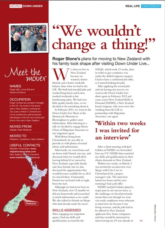 After engaging our migration agent, I had my skills and qualifications accessed by the NZQA, which took 12 weeks, then in order to get a residence visa under the skilled migrant category I had to have a confirmed job offer, so I started looking for jobs. After applying for several jobs and not having any success, we went to the Down Under Live show again in February 2012 and came across New Zealand Skills in Demand (NZSID), a New Zealand based company, who were now also working from the UK in partnership with Migration Associates, our agent.
